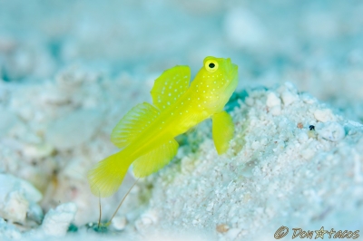 JUGEMテーマ:水中写真 砂地の根などに普通にいて、あまり動かず、逃げず、カメラの練習台に最適。 まだ色の出ていない幼魚もいいのですが、 成魚の第一背びれが開いた時がチャンス!意外にキレイ! 条鰭綱 スズキ目 ハゼ科 サラサハゼ属 キンセンハゼ 石垣島 川平湾 水深5m サイズ3cm 2018年12月 撮影:Don☆tacos 石垣島 荒川沖 水深15m サイズ2cm 2016年7月 撮影:Don☆tacos