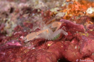 JUGEMテーマ:水中写真 雰囲気はサラサエビっぽくて、ショップでもアカモンサラサエビ属ではないかと言われていたので、 調べたのですが、似たようなエビがヒットせず、そのままでその1種と言うことで。 十脚目 抱卵亜目 コエビ下目 イトアシエビ上科 サラサエビ科 アカモンサラサエビ属 アカモンサラサエビ属の1種 石垣島 竹富沖 水深10m サイズ1cm 2014年6月 撮影:Don☆tacos