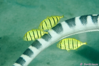 JUGEMテーマ:水中写真 よく、サメとかエイとかの鼻先を泳いでいます。 きっと泳ぎに自信があるのでしょう。 この子たちはウミヘビでした。 条鰭綱 スズキ目 コガネシマアジ属 コガネシマアジ 石垣島 川平湾 水深5m サイズ5cm 2020年7月 撮影:Don☆tacos