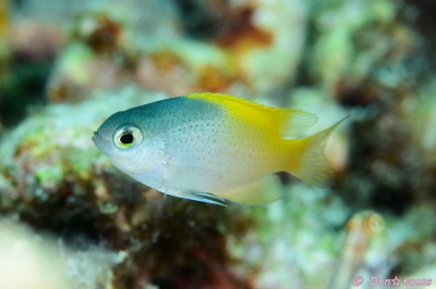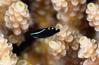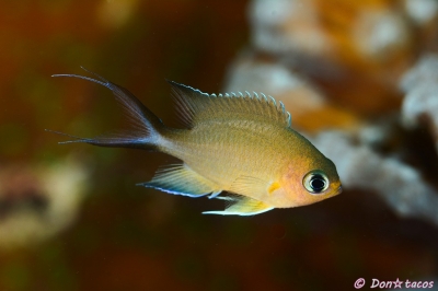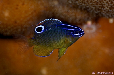 JUGEMテーマ:水中写真 これより小さいヤツの撮影は無理だと思います。 条鰭綱 スズキ目 スズメダイ科 アツクチスズメダイ属 アツクチスズメダイ 沖縄本島 万座沖 水深10m サイズ1cm 2018年6月 撮影:Don☆tacos
