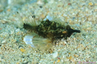 JUGEMテーマ:水中写真 通称はピグミーシードラゴン、またの名をモジャピグ、 学名:キオネミクティス・ルメンガニィ(Kyonemichthys rumengani)と呼ばれる糸くずのような魚。 どう撮れば分かり易いのかいまだ分からず。 条鰭綱 トゲウオ目 ヨウジウオ科 Kyonemichthys属 ピグミーシードラゴン 沖縄本島 砂辺沖 水深15m サイズ3cm 2014年7月 撮影:Don☆tacos