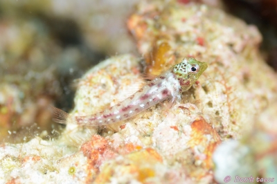 JUGEMテーマ:水中写真 属、学名、すべて不明、謎の人呼んでリーゼントヘビギンポ。 条鰭綱 スズキ目 ヘビギンポ科 リーゼントヘビギンポ??属 (仮称)リーゼントヘビギンポ 沖縄本島 真栄田岬沖 水深30m サイズ2cm 2019年7月 撮影:Don☆tacos