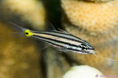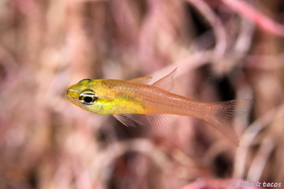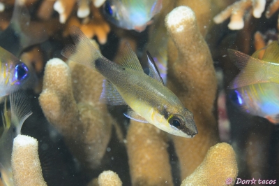 JUGEMテーマ:水中写真 ウスモモちゃん似のテンジクダイ、アオハナでいいのかな? ウスモモちゃんの尾びれのつけ根には点が・・”そんなの関係ねえ!”って、 わけにはいきません。 条鰭綱 スズキ目 テンジクダイ科 スジイシモチ属 アオハナテンジクダイ 石垣島 荒川沖 水深20m サイズ3cm 2019年6月 撮影:Don☆tacos