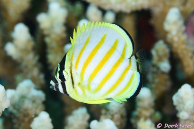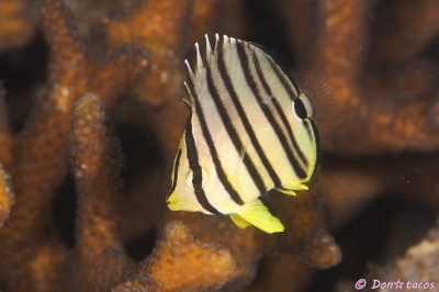 JUGEMテーマ:水中写真 縞を数えると目立つところは6本のような、でもそんなの関係ねえ! 結構浅いところで見かけるような気がします。 条鰭綱 スズキ目 チョウチョウウオ科 チョウチョウウオ属 ヤスジチョウチョウウオ セブ マクタン島 マクタン沖 水深5m サイズ3cm 2017年1月 撮影:Don☆tacos 石垣島 荒川沖 水深5m サイズ3cm 2017年10月 撮影:Don☆tacos