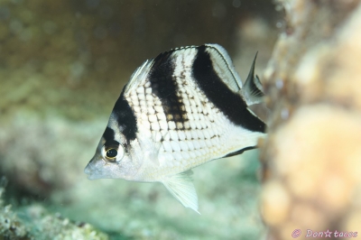 JUGEMテーマ:水中写真 地味目なので、AKBに例えるとセンターから外れてるといったところ。 カメラオタクから狙われなくていいか? 条鰭綱 スズキ目 チョウチョウウオ科 チョウチョウウオ属 カガミチョウチョウウオ 沖縄本島 真栄田岬沖 水深10m サイズ5cm 2019年7月 撮影:Don☆tacos 石垣島 伊土名沖 水深10m サイズ5cm 2015年5月 撮影:Don☆tacos
