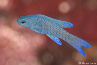 JUGEMテーマ:水中写真 暗いところにいて黒く見えますが、フラッシュでブルーになります。 真横から撮るのが難しい魚です。 条鰭綱 スズキ目 タナバタウオ科 ツバメタナバタウオ属 ツバメタナバタウオ 石垣島 荒川沖 水深10m サイズ5cm 2019年7月 撮影:Don☆tacos 普通に撮るとこんな感じ 沖縄本島 名護沖 水深10m サイズ5cm 2014年11月 撮影:Don☆tacos