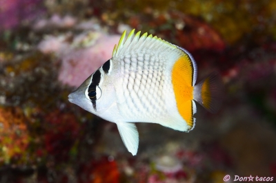 JUGEMテーマ:水中写真 カラフルなチョウチョウウオは南の島にハマります。 いいサイズ、でもヒレが切れてちょっと残念、いや背景も残念・・・斬る!? 条鰭綱 スズキ目 チョウチョウウオ科 チョウチョウウオ属 アミメチョウチョウウオ 石垣島 荒川沖 水深5m サイズ3cm 2015年5月 撮影:Don☆tacos