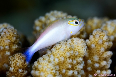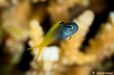 JUGEMテーマ:水中写真 尻尾がブルーなのは婚姻色?ネットで誰かが言ってたような気がしたが勘違い? 条鰭綱 スズキ目 ゴンベ科 ホシゴンベ属 メガネゴンベ 石垣島 大崎沖 水深5m サイズ5cm 2015年11月 撮影:Don☆tacos