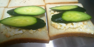 JUGEMテーマ:*食べ物の写真* ご来店くださったお客さま、 中央病院の売店でお求めくださったお客さま、 ありがとうございました。 昨日、届けていただいた、ほーりーふぁーむさんのきゅうり。 たまごサラダのサンドウイッチに使いました!!! 初成りのものは太いとのことで、2枚で食パンいっぱいの大きさ!!! 皮も柔らかく、美味しいきゅうりです!!!