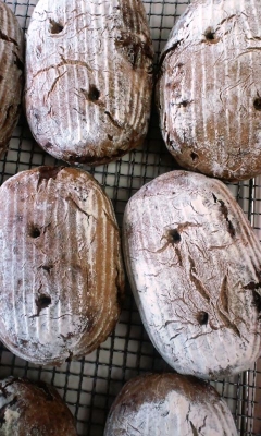 JUGEMテーマ:*食べ物の写真* 今日は少し涼しくて過ごしやすかったですね☆ ご来店くださったお客さま、 中央病院の売店でお求めくださったお客さま、 ありがとうございました。 昨日から今日にかけて、ライ麦パン5種類、次々焼きました!!!! まず、昨日の夕方 フルヒテブロート2種類 ドライいちじく、レーズン、くるみ、レモンピール、オレンジピールなど、 具財がどっさり、生地の2倍も入るのです!!! 発酵や、焼成の時間が長くかかり、焼き上がりは閉店後6時半過ぎ...