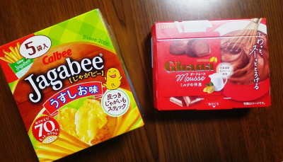 JUGEMテーマ:*食べ物の写真* こんばんは、すみれです! 今日は私の3時のおやつをご紹介。 スーパーで買ってきた じゃがビーとガーナムースです。 箱を開けるとこんな感じ。 どっちも個包装になってるので、食べたい分だけ食べられていいね。 ポテトもチョコも子供の頃から大好き♪ 味や見た目はもちろん、お菓子の代表格というイメージで 食べてると 今 休憩してるな〜って気分になるからいい。 ニキビができやすい体質なので、最近はたまにしか食べないんですが 好物であることは変わらず。 ...