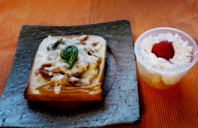 JUGEMテーマ:*食べ物の写真* 習慣で、朝5時には目が覚めて、「あっ、今日は日曜日なんだ!!!」とまた寝たのでした。 朝食は、食パンに、昨夜の残りのチンジャオロースと、溶けるチーズをパラパラと乗せ、 トースト。トッピングは、頂き物のコゴミ!春らしい〜〜〜☆ デザートはサヴァラン。 今日、明日と連休になります。 ご不便をおかけいたしますが、どうぞよろしくお願いいたします。
