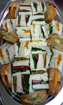JUGEMテーマ:*食べ物の写真* 土曜日、日曜日、そして月曜日と、サンドウィッチ・オードブルや、 サンドウイッチ・ボックスのご注文が続きます!! ありがたいことです☆ ご注文をくださった方に、ご希望をお聞きして、毎回違った内容でお作りしています。 土曜日は高校の野球部の生徒さんたち!!! 日曜日はギャラリーのパーティー☆ さて、月曜日は?? 2、3日前までに、お電話でご注文を承っております。 電話:025−526−6366