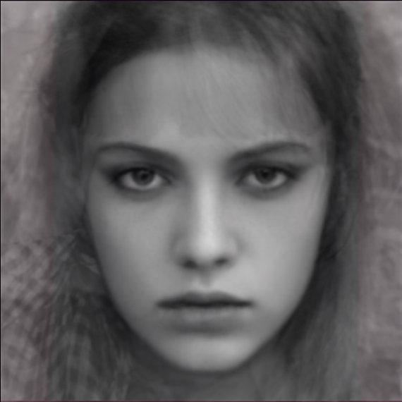 [Average face of 11 monochrome portraits] モノクロのポートレート写真11枚(女性のみ)の平均です。 平均顔ユーザーズガイドに戻る 平均顔アプリのダウンロードはApp Storeで