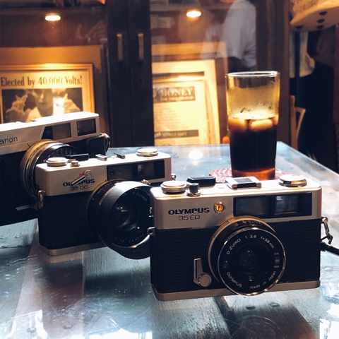 お客さんがフィルムカメラを持って工房へ寄ってくれました。手前がそのカメラなんですが、偶然にもほとんど同じカメラを工房に飾ってまして、色々違いを比べたりしながら楽しい時間でした。 ギャラリースペースの写真を何枚か撮ってくれたので、出来上がりが楽しみです。 お客さんのカメラはオリンパス35ED、僕のはオリンパス35DC。調べてみると、35EDは1974年、35DCは1971年発売という事で、どちらも70年代のものでした。 オリンパスのサイトは細かく掲載されていて、非常に面...