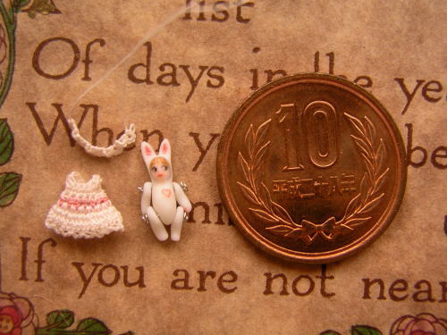 2019年5月30日のブログの続きです☆ 次はウサギの着ぐるみminiちゃん。 この子も1cmシリーズですが、 お耳の分、他の子よりやや大きい全長1.3cm。 こちらも思い付きの行き当たりばったりで 「この子、服を着たらどんなだろ?」と ボディがほぼ同じ大きさの1cmガールちゃんの編み図を参考に 服と襟を編んでみました。 着れたー♪(*^^*) ワンピの後ろは糸で縫い留め、 襟はボンドで貼りました。 リボンは前に付けるつも...