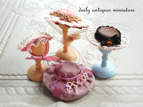 こんにちは。今日から9月ですね、、、。 東京は拍子抜けする程涼しくて、すっかり秋の気配です。 そして今月のミニチュア製作も、先月とは打ってかわって帽子を作り始めました 後半はハロウィンのミニチュアも作る予定〜 さてお帽子4タイプ出来上がりました。 レトロなのもヴィクトリアンのもロココのも、古い帽子はみんな好きです。 こういうのは絶対自分では被れないから、ミニチュアで楽しむことにします。 一番かわいらしいタイプ。 上の画像で言うと、真ん中上のになります。 帽子は角度によって、全然違う風にも見...