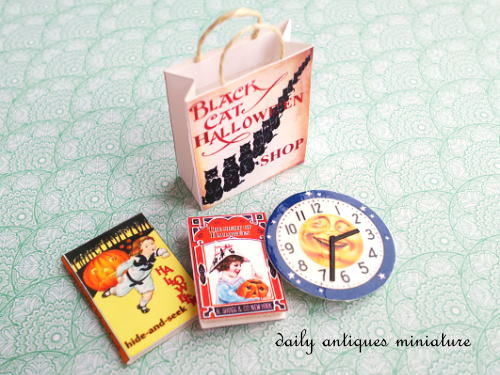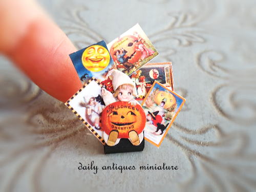 こんにちは。 今月はなんやかんやと諸用が入っていたり、製作以外にやる仕事が多くて、ちょっと とっ散らかっております。 いや、、、優先順位を考えないと〜(←自分に言ってる)。 ハロウィンのミニチュアも同時進行でいっぱい手を付けてしまって。 本当ならもっとたくさん出来た時点でお見せしたかったのですが、とりあえず今 完成しているものを。 上から、ハロウィンポストカードスタンド、ハロウィン・クッキーの箱、 ジャックオランタンのポスターに、ハロウィン(黒猫)紙皿。 ポストカードスタンド、先に載...