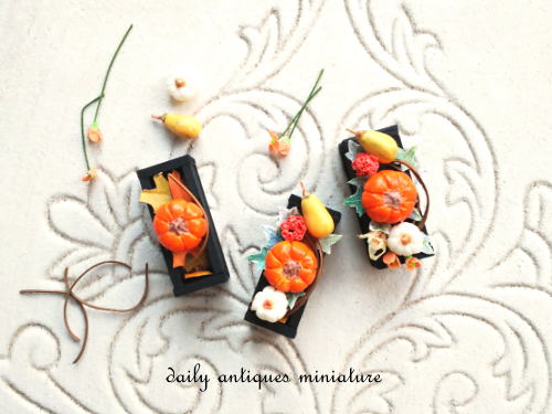 この数日、猛ダッシュで最後の追い込みをしています (このパターン多し、、、しかも大物が最後ってパターン) 製作途中だったものが次々出来上がりました。 間に合って良かった〜 こちらはパンプキンデコレーション♪ 3種類のパンプキンと、お花やアイビーなど黒いボックスにぎゅぎゅっと詰めてみました。 秋らしいデコレーションは欲しいけど、子供っぽいハロウィーンは好きじゃないという方にも 楽しんでいただけたら嬉しいです。 1つ1つ型取りはせず作っていますので、少し個体差があります。 アレンジもバランス...