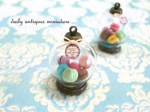 こんにちはー。 今週はずーっと、マカロンを作っていました^^。 これが結構な単純作業、、、ひたすら、忍耐です。 7色を結構いっぱい作りました。 これらは、2つのアイテムにアレンジ♪ 1つは、ガラスの瓶に詰めてみました。 上下の部分は金属製です。 瓶の構造上、マカロンは接着はせず。ゆするとマカロンが動きますので、お気に入りの 位置にしてみて下さいね アンティークふうなタグを付けて、、、コレ、実際は肉眼ではよく見えません〜。 (上から撮ったので、タグが若干大きく写っています) カフェやお菓子屋...
