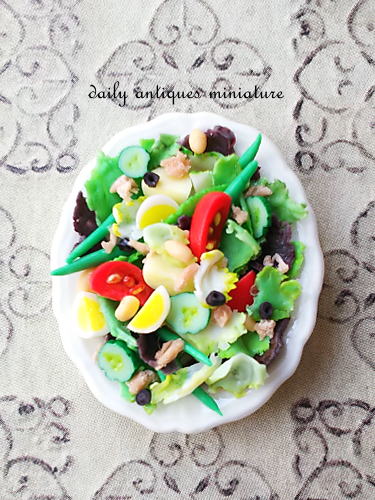こんにちは。 夏休みをいただいた分、超特急で作業をしております。 、、、お休みは出かけてしまうと全然休みにならず(汗)気分転換という感じですかねぇ 。 もう少し追加で食べ物を作ることにしました。 こちらはサラダ二ソワーズ。フランスのニース風のサラダです。 小さいバージョン(と言ってもモリモリ♪サラダプレートサイズ)と大皿バージョンを作りました。 小さい方にはフォークも付けました。 お気に入りの陶器のプレートを使いましたよ〜。 サラダ菜、レタス数種類、ゆで卵、トマト、ジャガイモ、きゅうり、...