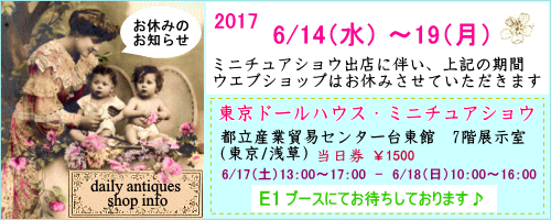 今年も恒例のミニチュアショウに参加致します。 ディーラーマップなど、ミニチュアショウの詳細は以下のページにてご確認下さいませ。 http://dollshouse.co.jp/ja/index/ ショーへは全ての商品は持っていけませんので、見たいアイテムがある方は、6/12までに メールにてご連絡下さい。 (ご購入いただかなくても大丈夫ですのでお気軽にお問い合わせ下さい♪) ウエブショップのお買い物は、6/13(火)15:00までにご入金いただけた分は当日発送、 それ以降は19(月)以降の発送とさせていただきます。 この期間は在庫...