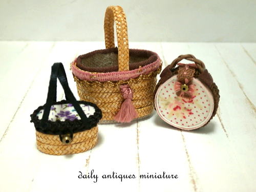 ミニチュアショウからもう1週間! 早い〜。 今月末も少量ながら、新商品の更新を予定しております。 と、いうわけで、、、少しずつ製作を再開。 ミニチュアのかごを作りました♪ とりあえず、できたのはこの3点。 蓋付きの楕円ミニバスケット、マーケット風の大きなかご、丸いお出かけバッグ。 バスケット好きのワタクシですが、夏になるとかごバッグが欲しくなる〜〜〜。 その欲求を、とりあえずミニチュアで解消(笑) 大きなかごは、タッセルと飾りをつけてちょっとボヘミアン風に。 上に付けたピンクの紐には金糸...