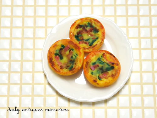 ほうれん草とベーコンのキッシュが焼けました〜♪ 今週は粘土ものを作っていましたよー。 今月は、フランスのフードやお菓子関係のミニチュアを作ろうと思っています。 んふ♡ キッシュはおいしそうに出来がりました。 (なんか指がシワッシワですけどね、、、水分不足だな、こりゃ) 土台のタルト、お菓子用に作り始めたのですが、これは絶対キッシュだ!と急遽変更〜。 ここからはお菓子チームです。 とりあえず、プチフールが4種出来上がりました。 こちらは上に薔薇の花びらを飾ったTartelette Rose(...