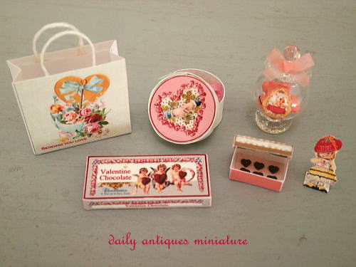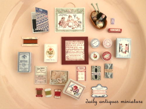 エンジンがかかるのが遅かった今月、今週は猛スピードで製作しております〜。 来週はもう更新日ですものね。 手芸関係のミニチュアがたくさん出来上がりました。 全部をアンティークのお皿にのせて撮影してみました♪ ランダムにご紹介します〜 まずはレースが入った箱。 かわいいローズ柄の箱にアンティークのレースをたくさん詰めました。 レースは、アイボリーや白や薄いピンクやブルーなど。 シャビーな雰囲気やヴィクトリアン、ロココなどがお好きな方におススメです! そういう私も大のお気に入り お花のイラスト...