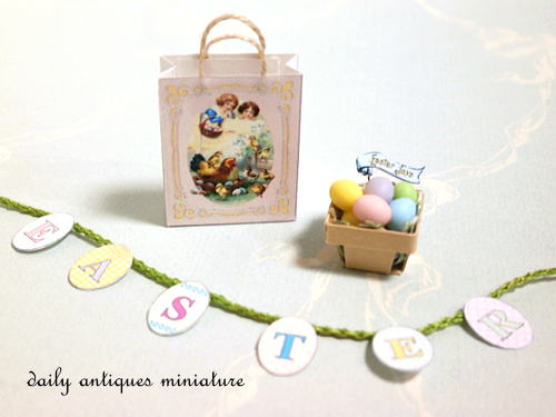 今週2回めの更新です。 小分けになっていますが〜、引き続きイースターのミニチュアのご紹介です♪ 紙袋、イースターエッグバスケット、フラックガーランド(旗飾り)。 紙袋はやさしいピンクとヴィクトリアンの絵柄がかわいらしい Mサイズの大きさでしょうか。 前回お見せした卵を使って、今年のイースターエッグ・バスケットはナチュラルな感じに。 市場風のかごに入れて、フラッグを付けました。 こちらはものによって少しずつレイアウトが違います。 卵の色はイースターらしくと作っていますが、毎年色が違っていま...