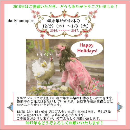 今年も早いもので残り5日となりました。 この12月、何とか乗り切った!という感じ。 当店は、あさって29日より1月3日まで年末年始のお休みをいただきます。 今月は製作時間が少なかったので、何か作りたい!気分^^です。 また来年もどうぞよろしくお願いいたします。 デイリー・アンティークスミニチュア専門店 http://daily-antiques.ocnk.net/ daily antiques English Blog on Facebook JUGEMテーマ:ミニチュア &nb...
