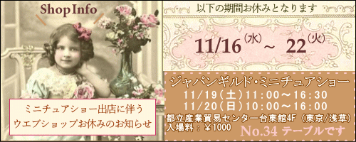 こんにちは。 すっかり寒くなりましたね。 先週の更新ではたくさんのお客様にお買い上げいただきまして、どうもありがとうございました 今週は発送と、アメリカから仕入れた物が来たのでその作業に追われていたのですが いろいろトラブルもあり、英文との対峙が長かった、、、あぁ。最近日本語だって怪しいのに この英語力でクレーム英文、、、キツイ〜。 さて、この時期になりました 年2回のショーの秋の方、ジャパンギルド・ミニチュアショーに出店致します。 前後を含み期間中はウエブショップはお休みとなります。 ...