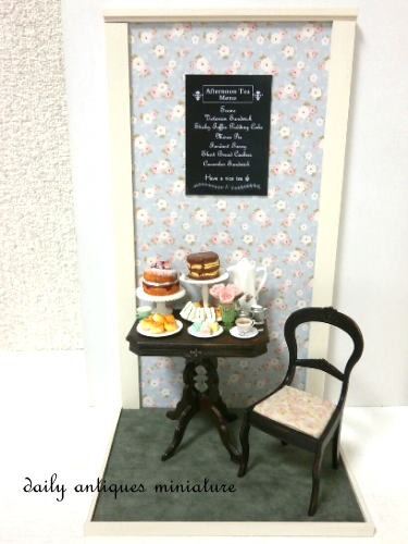 こんにちは 3週続けて詳細をご紹介してきました小作品、完成しました〜。 (じらし過ぎ、、、みたいになってしまい、スミマセン) クラシックなイングリッシュ・アフタヌーンティーのテーブルです。 もう1つの作品もそうなのですが、今回一番気を遣ったのは壁紙のデザインです。 これで全体のイメージが決まってしまうので、私が思うイメージとピッタリのにしたかった。 この壁紙、作ったの実は3枚めです。先の2枚は(花柄でしたが)合わせてみるとイメージと ちょっと違ったんですよねー。 実際に組み合わせてみないと...