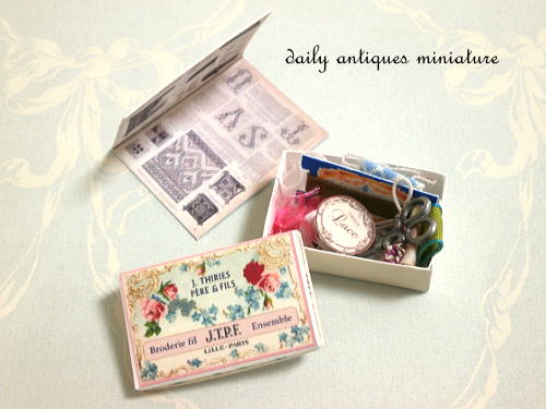 今週はちまちまと、、、 ソーイング小物のミニチュアを作っていました。一気に写真に撮るとこんな感じです 大好きな箱モノは、ラブリーな3種類。 一番のお気に入りは一番上の大きいのなのですが、時間があれば()中に刺繍糸とか入れた バージョンも作りたいと思っています。 左側の箱はプランタンの古いデザイン。 パリのデパート、オ・プランタンは1865年開業。 (ボン・マルシェの元店員だった人が開いたそうですよ) だからこんなアールヌーボーっぽいデザインでも不思議はありません。 日本ではプランタン銀座の...