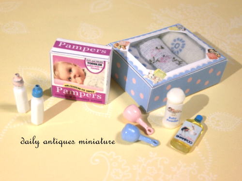 こんにちは。 4月に入りましたね〜。春らしい暖かさになってきました。 さて、先週は発送作業を中心にさせていただいてましたが、ベビーものをちょこちょこ 作り始めました ↑哺乳瓶とガラガラはインポートものです♪ この昔のパンパースのパッケージが個人的に大好きで、ミニチュアにしてしまいました^^。 この赤ちゃんがかわいいんだよなぁぁ・・・ 箱は開きません。 紫なので、女の子でも、男の子のお部屋でも。 インポートものの哺乳瓶は量産品としては小さめサイズです。 下はプラスチックで上は金属製。 ...
