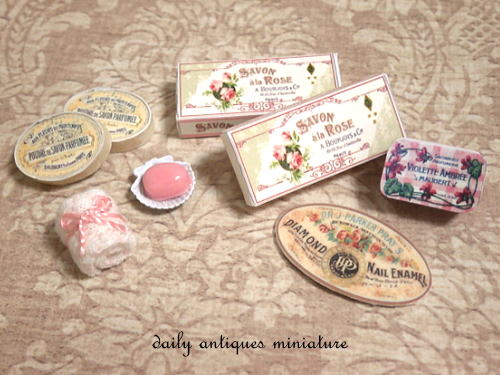こんにちは。 先週に引き続き、バスルームの小物のご紹介です。 四角い2点は石鹸の箱。 楕円のはパウダーボックス。 どれも開かないタイプではありますが、アンティーク風のかわいいパッケージは バスルームのいいアクセントになってくれること間違いなしです。 ダイヤモンドネイルエナメル、と書いてあるこちらもやはりアンティークのデザイン。 ラミネートをかけてホーロー看板風に。 初めは箱にしようと思っていたのですが、今回箱モノはいくつかあったので看板に しました。バスルームだけでなく、いろいろなシーン...