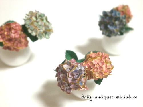 こんにちは。 今週はミニチュアのシャンデリアを作っていたのですが、使い過ぎのせいで?ボキッと 工具が壊れてしまい、、、作業が進まなくなってしまいました。 割と何でもネットで買ってしまうのですが、こういったものは画像だけだとイマイチ よく分からないので、週末に実際買いに行くことにします〜。 ということで。 気を取り直して、かわいいピッチャーを仕入れていたので、これに差すお花を作り始め ました。 とは言っても、このアジサイはキットのもの。 ネットショップやショーでも販売されている市販の物です...