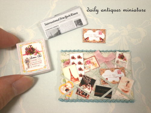 先週はステーショナリーのミニチュアを作っていました。 どれもアイテム自体は以前あったものですが、随分前にSOLDになってますので 装いも新たに、いろいろ改善して製作〜。 折った新聞は、何げに人気アイテムでした。玄関ポストに入れてもいいし、ベッド に置くだけでも朝のシーンができそうです。 お隣はアンティーク封筒。美しいモチーフと鳥のデザインです。 レターセットは、アンティークなお花柄です♪ 箱の中には、便箋、封筒、ミニカード、シールなどが入っていて、ばらばらになります ので、お好きなアレンジで...