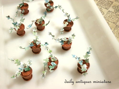 火曜日にも更新しましたが、さくっと一個だけ新アイテムのご紹介です。 鉢入りのアイビーを作りました。 上の画像は、まるで栽培工場のような風景がおもしろかったのでパチリ。 大きく映すとこんな感じです。 近づくとリアルに見えます〜。 肉眼だと上のような感じなんですが(笑)。 1つ1つ、葉っぱの形や色、全体的な形状が違います。 カップの中にアイビーを入れた商品は以前にも作りましたが、鉢植えがあったらいいな〜 とずっと思っていました。 お庭のシーンはもちろんのこと、玄関とかキッチンとかバスルームと...