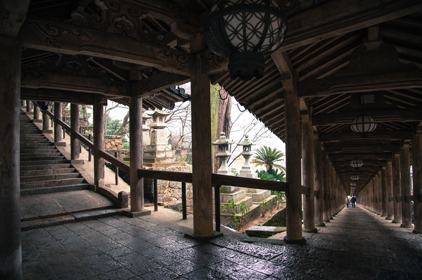 JUGEMテーマ:旅写真 Canon EOS 5D Mark ?+EF24-105mmF4L IS USM 奈良県桜井市・長谷寺 2015.3.29撮影 「399段の登廊」 屋根付きの階段(登廊)のお陰で、本堂まで雨に濡れずに辿り着くことができました(*^_^*) この登廊は全部で108間(1間は約1.8m、柱間)、399段あるそうです。 階段を上りながら108の煩悩を落とし、399段を上りきり400段目、四(死)を越えた所で本尊十一面観音様にお目にかかるのです。