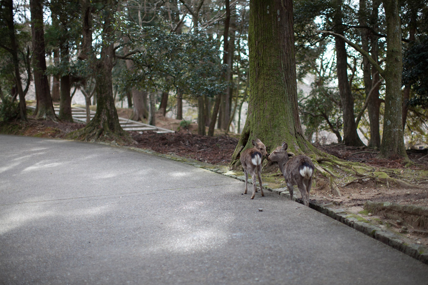 JUGEMテーマ:旅写真 Canon EOS 5D Mark ?+EF50mmF1.2L USM 奈良県・東大寺 2013.1.5撮影 側溝に入って子鹿に目線を合わせる親鹿の姿に ささやかな愛情を感じました。