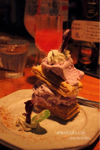 さて! 石垣島に戻りまして(だれるから端折ります)、楽しみにしていたディナー! BananaCafeさんです。 カフェというか、おしゃれバーの雰囲気。 ことりっぷでこの名物ミルフィーユの写真を見て「女子会にはこれだ!」と、 2ヶ月以上前から予約させてもらいました。 ふわふわのパイ生地と紫芋アイス〜もちろん美味しかったです。 よくぞ食べちゃう前にちゃんと撮った。 なかなか綺麗には食べられませんもんね^^;