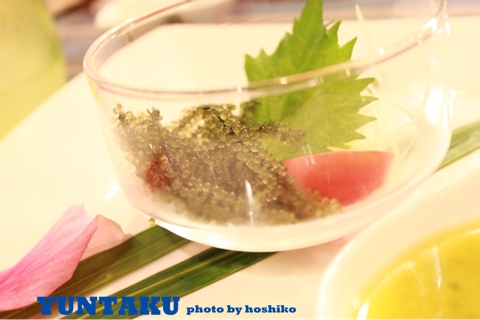 大晦日はまったく観光をしていないので、食事ネタばっかりで恐縮です。 一年の締めくくりのディナーは、東京から予約しておきました。 ホテルのレストラン「ゆんたく」。おしゃべり、って意味の沖縄言葉だとか。 写真は、これぞ沖縄!海ぶどう。オリーブオイルのソースが大人味。