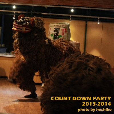 豪華なお食事を終え、部屋で紅白をチラ見したり、ワンコインバーで飲んだり、 ひたすらのーんびり過ごしていた私たち。 こんな時間帯に実家にいないなんて初めてですよ。 もうそろそろ2013年も2時間くらいかな、という頃、 朝食を頂く大きな食堂で、カウントダウンパーティが始まりました。 地元の方の獅子舞から〜 撮るのは難しいけど近くまで来るのでなかなかの迫力! お!!