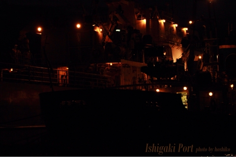 パーティではしゃいだ後は寝付きもよく、元旦の朝は5:30に起床。 初日の出クルーズに出発します。 ちなみにホテルにもオリジナルで陸上から見る初日の出ツアーがあったのだけど、 今回我々はJTBのオプショナルを利用して、石垣港から船に乗りました。 まだ暗いうちに出航。最初の写真は、海上保安庁の船たち。かっこいい・・・