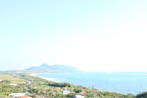 ふんわり〜 と、ここは玉取崎展望台。石垣島の東側にあって、青い海を一望できます。 あーなんて気持ちがよいの。 この写真は北側を眺めたところ。反対を向くと、