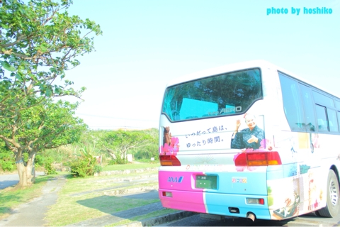 さて。ついに観光スタート、ということでここからカメラ女子の萌え満載なんですが、 一回もったいぶりますよ。 今回の石垣島旅行は、往復ANA便を利用したので、 専用バスで石垣島1週ツアーに参加できました。無料(というかそもそものツアー代に込み、というか)。 実は私も相方も完全なペーパードライバーなので、 沖縄なんかだとけっこうハンデなんです。こういうサービス助かる!! 写真は丸一日お世話になったバス。カラフルでめっちゃ可愛いの!! お天気もいいし、最高です。