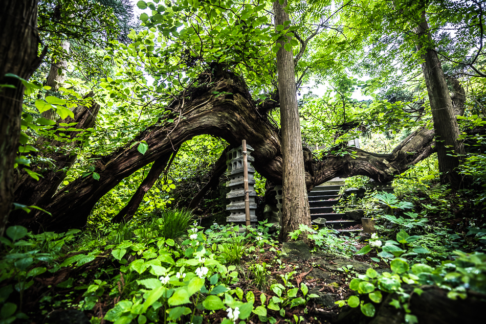 午前中は、ゴミ拾いのボランティアに参加。 南片辺から岩谷口へ、県道沿いにぽつぽつ...というほどゴミは無く。 雨だけが、ぽつぽつと降っていました。 雨の日にカメラを出せる場所、まず頭に浮かんだのが『関の寒戸さん』でした。 コンクリブロックに支えられ、神社の前に横たわる木。 しっとりとした空気。 この写真を見て神社と分かる人は、そうそうおらんでしょう。 苔も良...