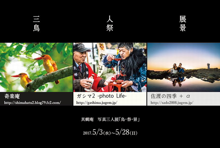 三人展 鳥祭景 臆面もなく、恥ずかしげもなく、やります。 5月3日(水)〜5月28日(日)です。 相川は京町通り「其蜩庵」です。 皆さまのお越しをお待ちしております。 JUGEMテーマ:カメラ JUGEMテーマ:名所 JUGEMテーマ:ひとりごと JUGEMテーマ:つぶやき。 JUGEMテーマ:地域/ローカル JUGEMテーマ:SONY デジタル一眼カメラ アルファ JUGEMテーマ:SONY ...