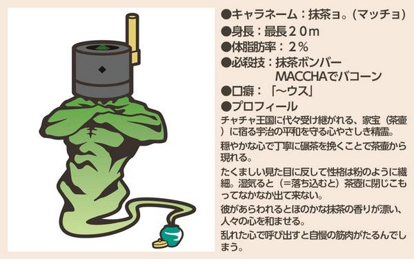 JUGEMテーマ:ゆるキャラ探し なんでも、宇治市のゆるキャラ「抹茶ョ(マッチョ)」がちょっと攻めすぎじゃないのっていうぐらいキレっキレですね@@ 「抹茶ョ(マッチョ)」